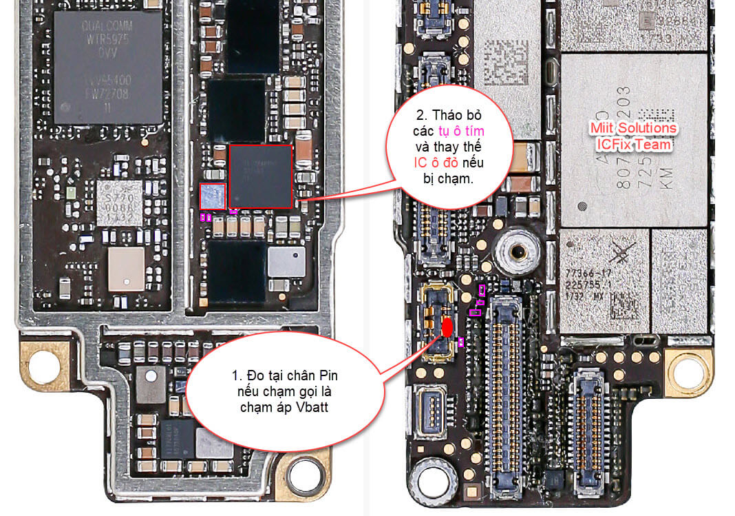 Khi cấp nguồn kim dòng vút lên cao cho tới sụp. Đo tổng trở tại chân Pin (chân đánh dấu đỏ trên hình) nếu chạm gọi là chạm áp Vbatt.