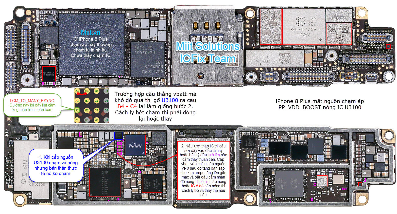 Từ iPhone 7 trở lên áp Vboost do một IC đãm nhiệm. Nó nhận áp vbatt đi vào và xuất ra áp vboost. Một trong các IC sử dụng áp Vboost hoặc tụ lọc trên đường áp bị chạm sẽ gây nóng IC tạo áp Vboost.