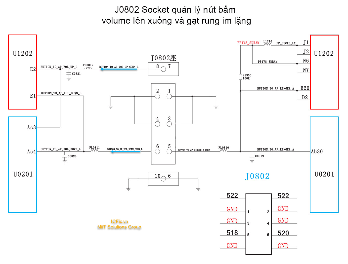 - Dựa trên sơ đồ chúng ta thấy được chân nút lên (vol up) là chân số bảy và tám. Chân nút xuống giảm âm lượng (vol down) là chân số Sáu trên socket J0802 trên socket có thêm các đường nút khác như nút gạt rung và các chân nối mass. Mỗi chức năng nút bấm sẽ có đường mạch xử lý riêng, lỗi phần nào thì tách riêng sửa phần đó. Ví dụ lỗi nút lên thì chúng ta dựa vào sơ đồ ta thấy nút lên tăng âm lượng sẽ từ chân số bảy và tám đi qua cuộn dây FL0812 vào IC nguồn U1202 và vào CPU U0201. Trên đường đi có nối với các tụ điện Cxxx xuống mass để bảo vệ điện áp phát sinh ngược khi thực hiện thao tác bấm.