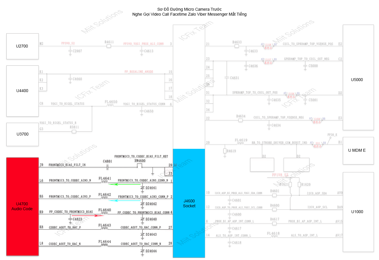 Trên sơ đồ bạn thấy Socket J4600 có rất nhiều chân. Mỗi chân là nó quản lý các chức năng khác nhau. Bạn chỉ cần quan tâm tới chân nào điều khiển Micro gây ra lỗi nghe gọi video call mất âm thanh. Trên hình sơ đồ là chân 1 – 2 – 4 các chân 29 30 33 sẽ nối mass để lọc. Các bạn sẽ thấy nó đi qua tất cả những linh kiện nào và vào tới IC U4700 thì chúng ta suy ra IC U4700 chính là IC chịu trách nhiệm việc quản lý Micro này đúng không nào. Bây giờ chúng ta bắt đầu vào main thực tế :