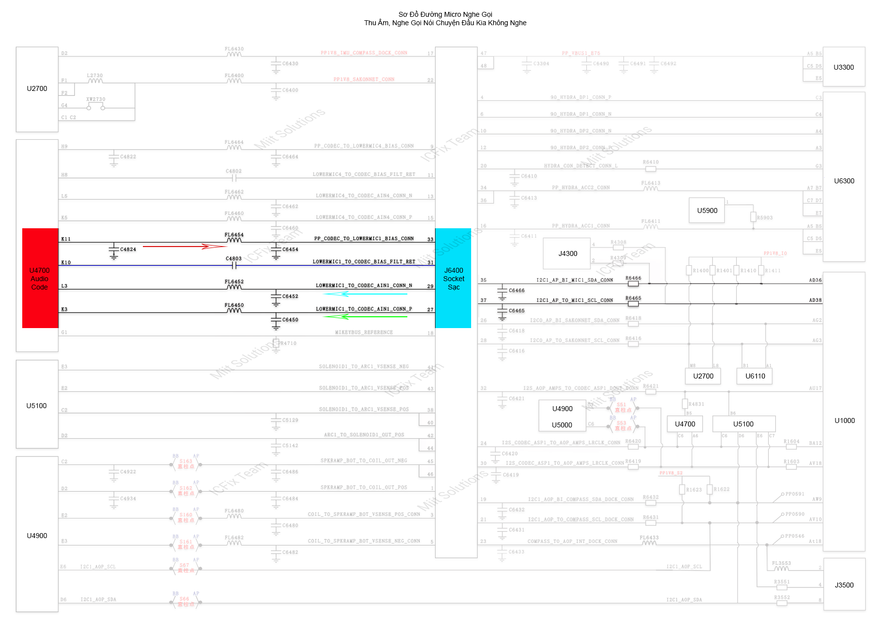 Trong một rừng chân nhưng lỗi chức năng nào chúng ta chỉ cần quan tâm tới các chức năng đó thôi. Bạn để ý các phần hiển thị nổi bật trên hình. Ngoài các chân micro từ socket sạc đi vào audio code còn có 2 chân mic số SCL SDA đi vào CPU. Hai chân này gây ra lỗi Reset counter báo Mic temp.