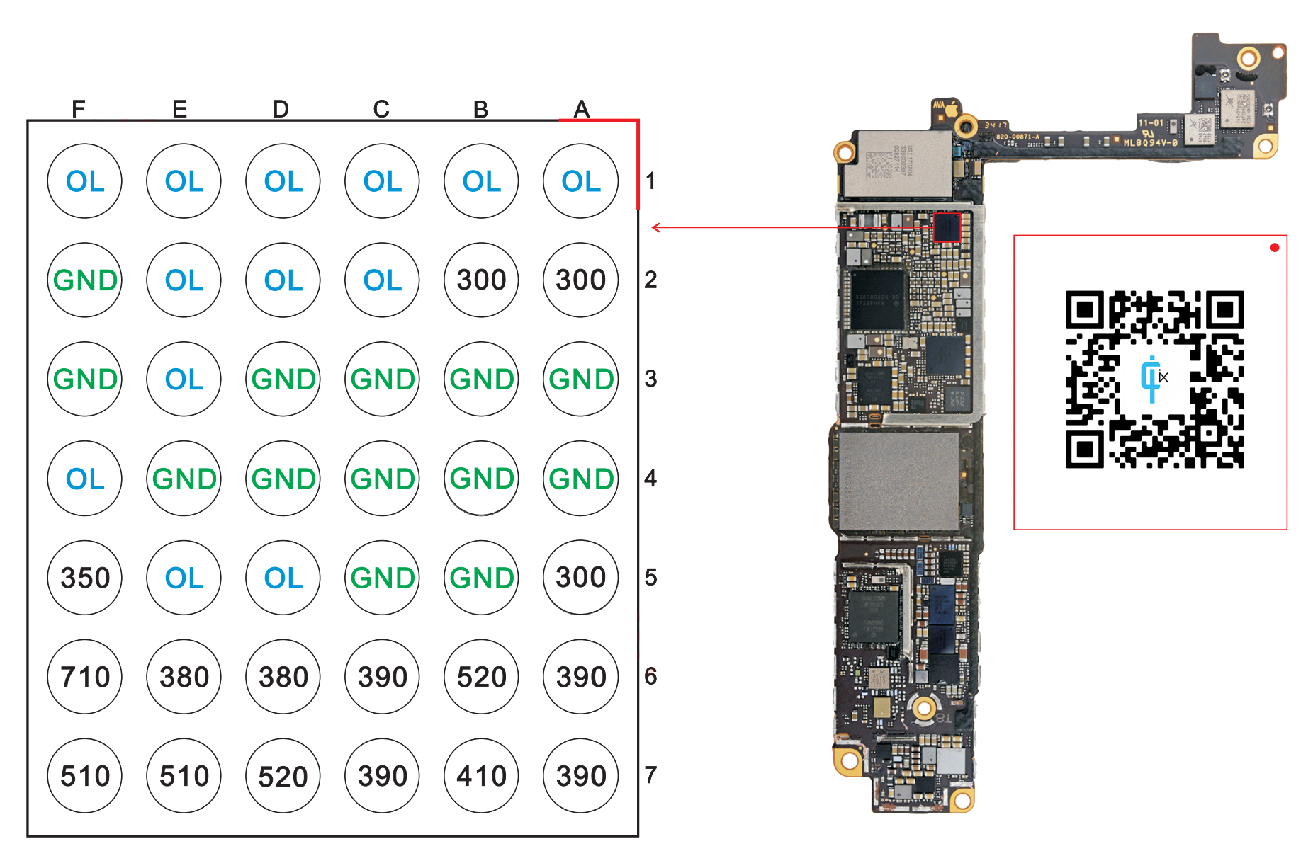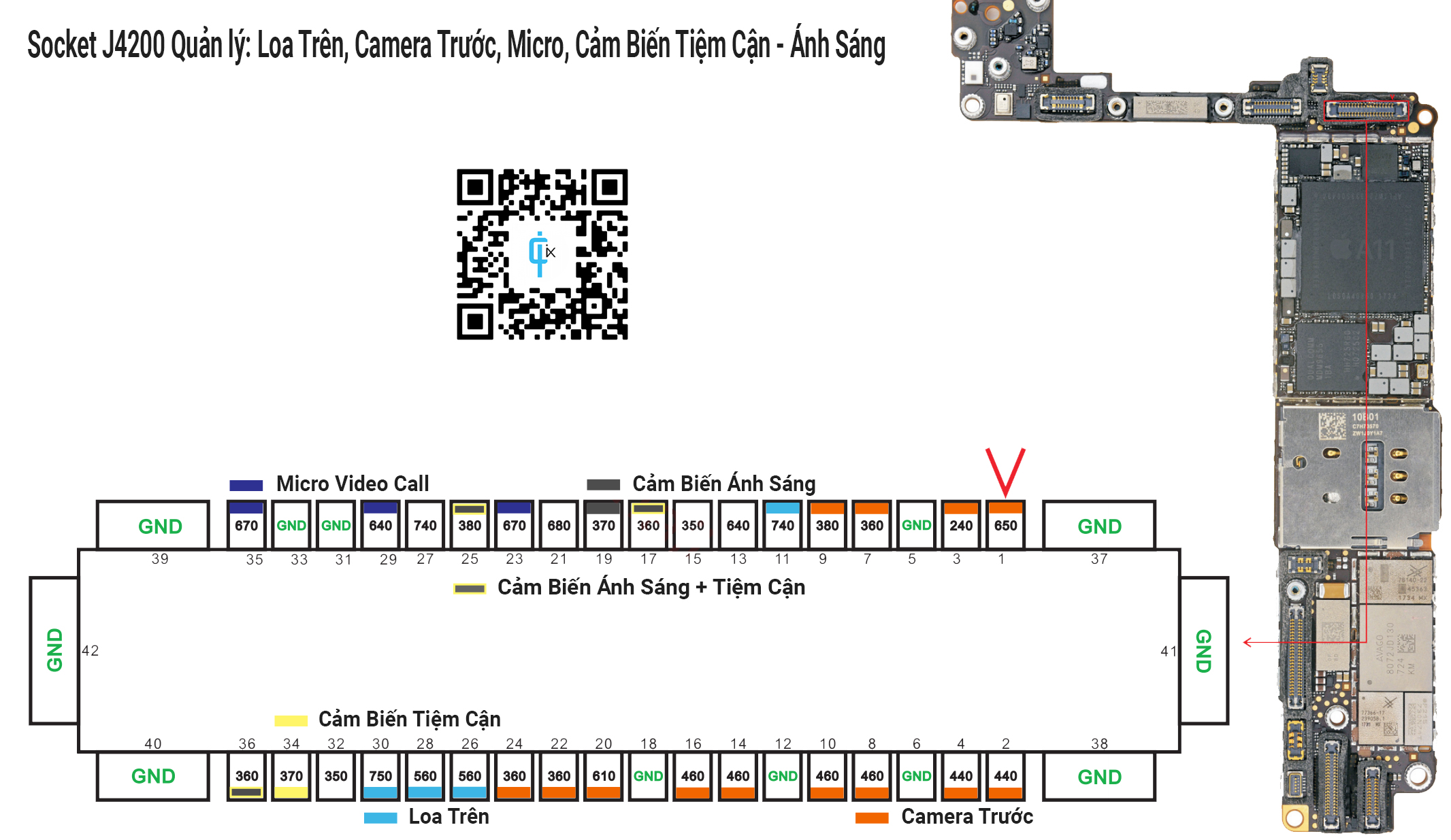 Tập trung vào các chân màu Xanh. Có 4 chân là các chân loa của iPhone 8.