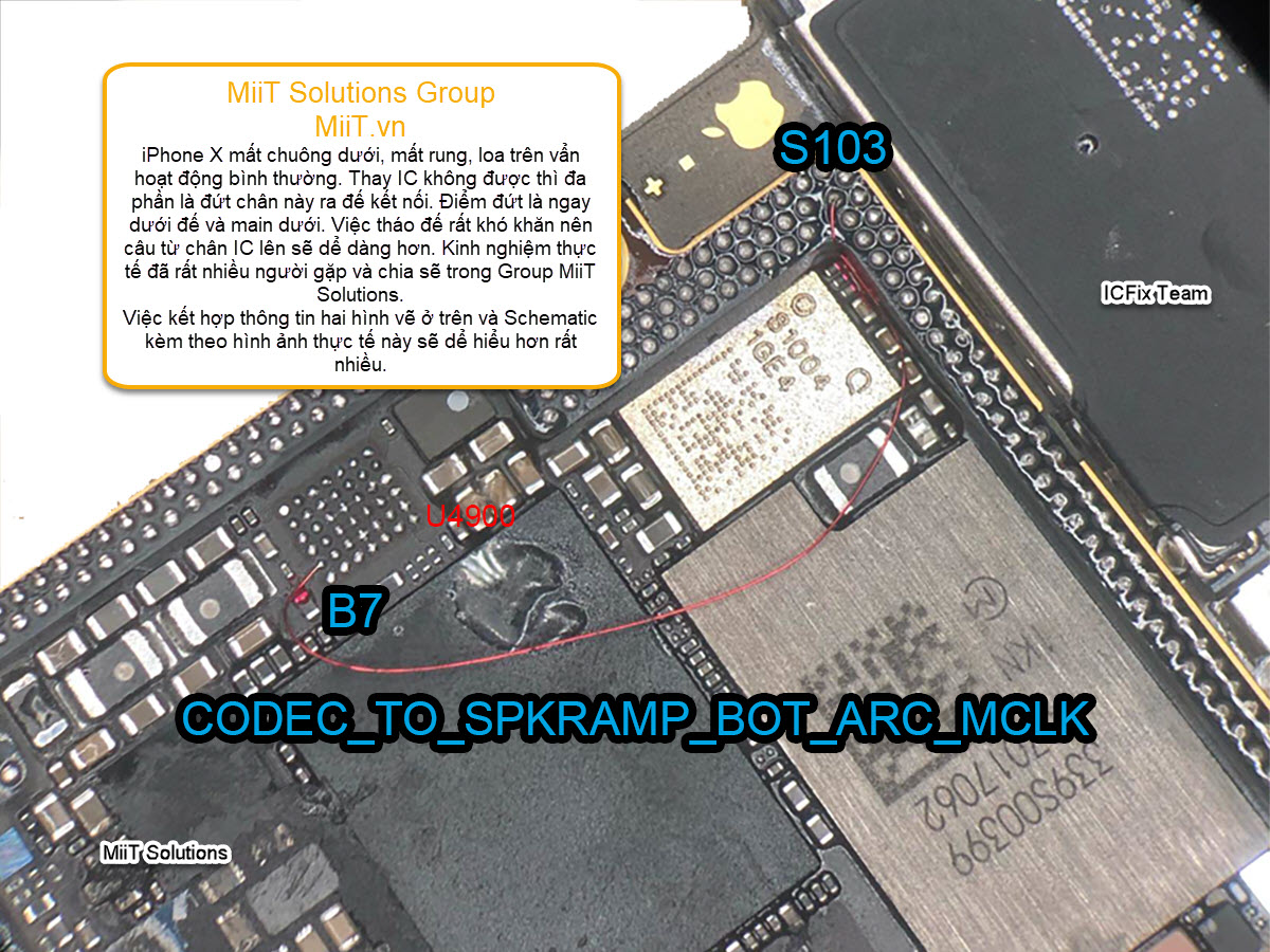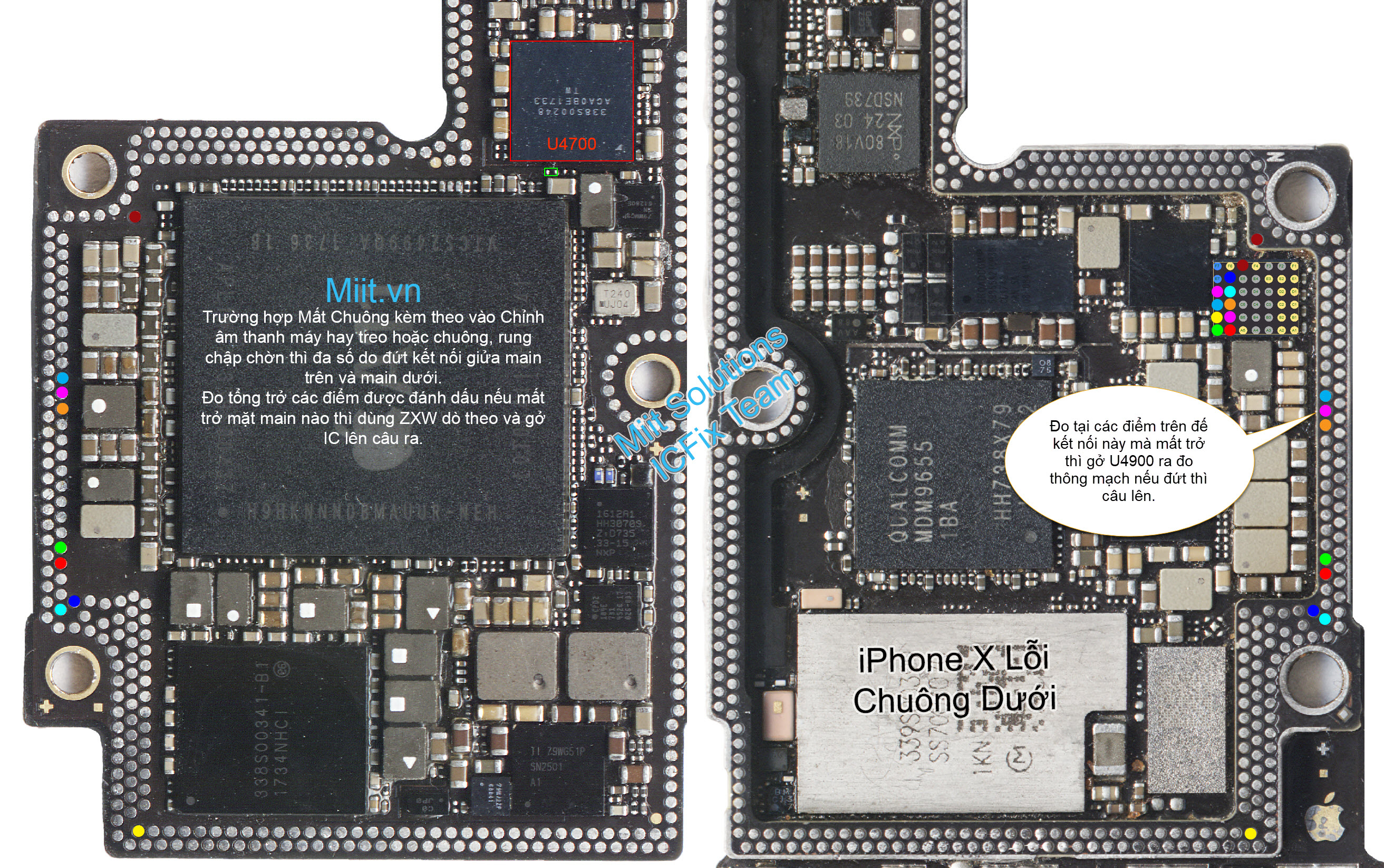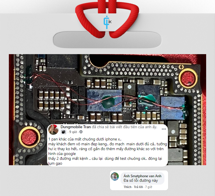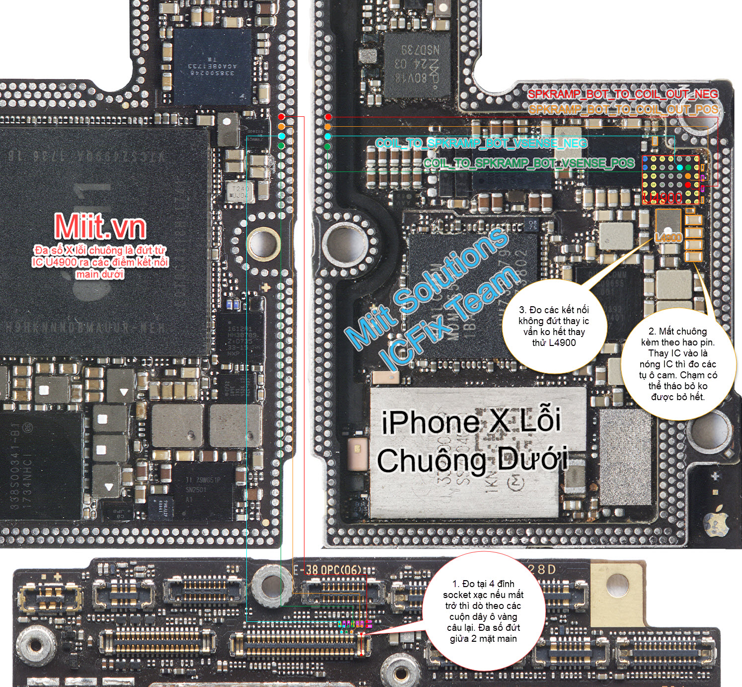 iPhone X có hai IC chuông dưới và trên ngoài ra có thêm IC rung ( Taptic engine) cả ba đều có những đường điều khiển chung từ CPU ra nên các trường hợp treo lag mất hoàn toàn âm thanh rung thì có khả năng chạm một IC nào đó hoặc đứt đường điều khiển chung từ CPU ra. Còn trường hợp chỉ bị duy nhất là chức năng chuông dưới ( loa ngoài ) thì chúng ta tập trung đo và xử lý.