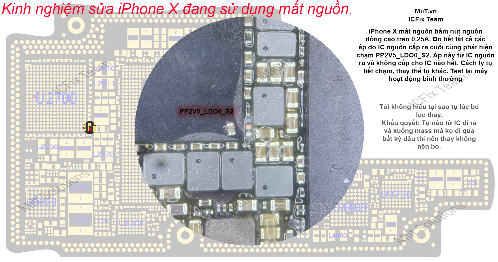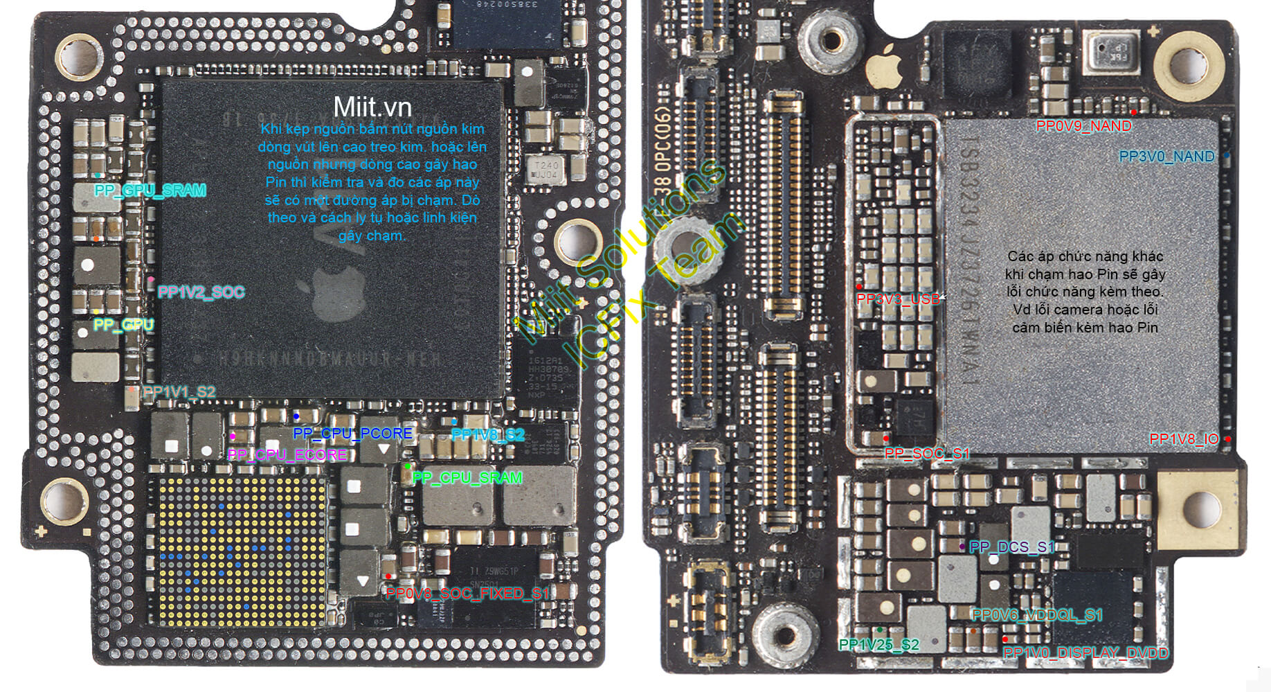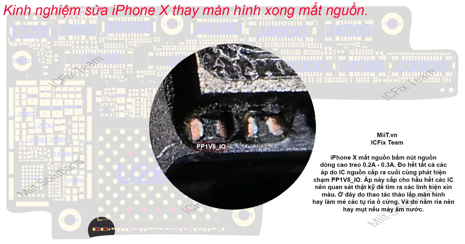Các điểm được đánh dấu đại diện cho các điểm đo nhanh. Khi iPhone X mất nguồn do áp thứ cấp bạn phải đo hết tất cả các đường áp từ IC nguồn cấp ra cho tới khi tìm thấy một đường bị chạm.