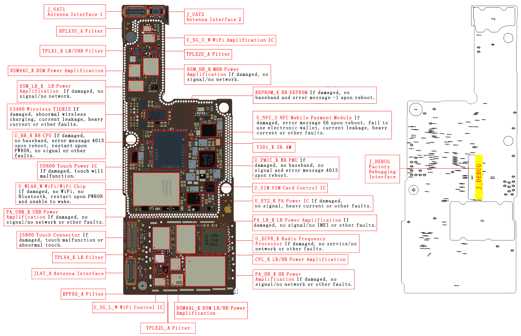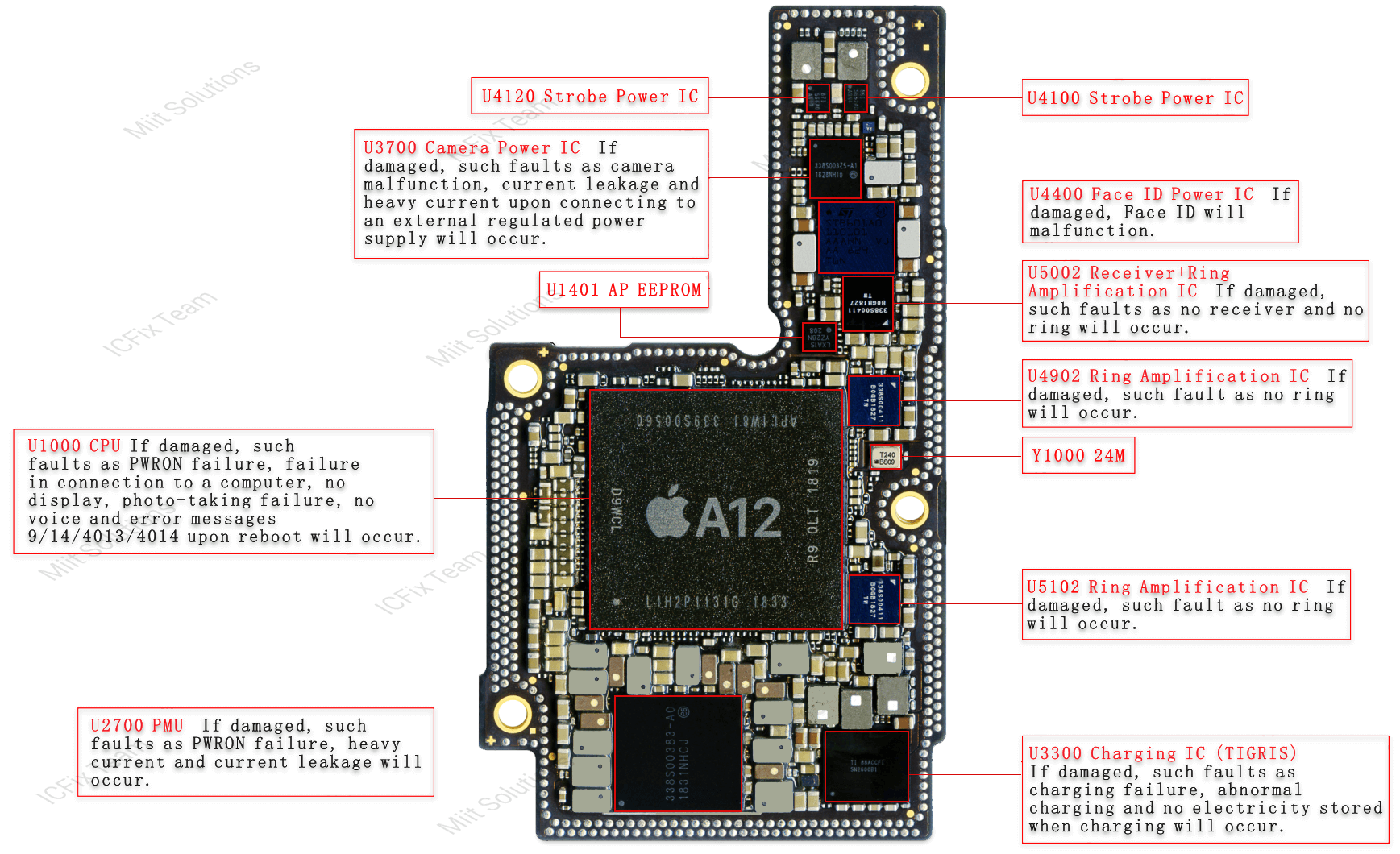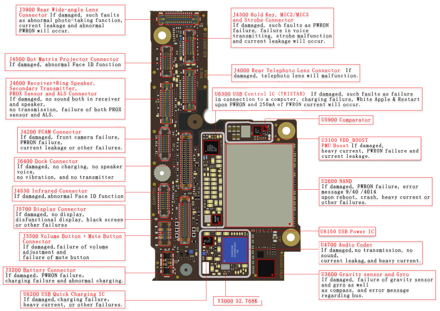 Vị Trí, tên và chức năng linh kiện iPhone Xs. Để biết được chức năng của IC và khi IC hư hỏng sẽ gây ra lỗi gì bạn xem và nhớ các hình trong bài này. Nắm được các vùng các khu vực sau này chỉ cần quan sát là đã biết được khả năng lỗi của main.