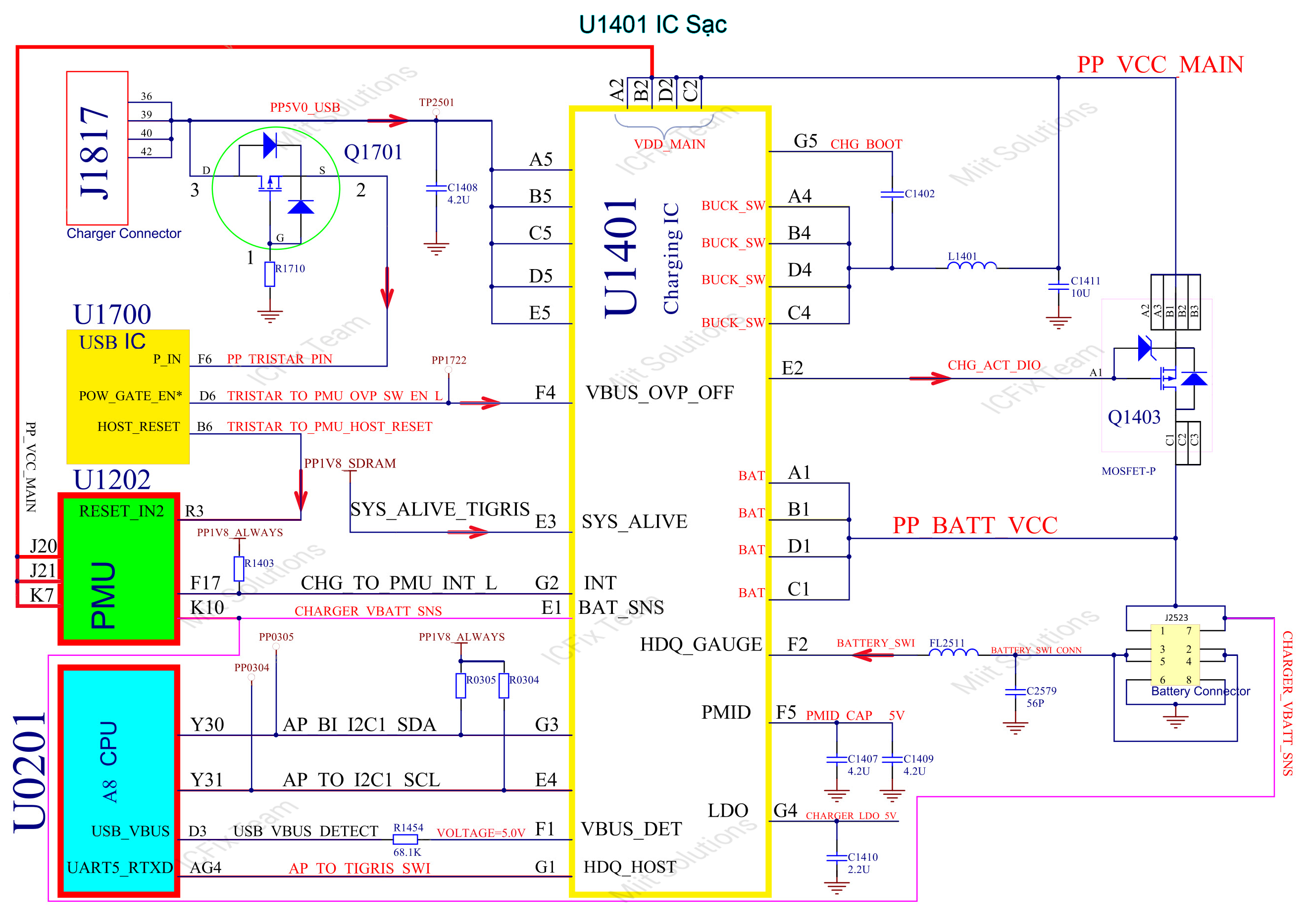 Trường hợp 2: Nếu Pin nhận data đầy đủ và sạc báo sạc nhưng không vào Pin hoặc báo sạc nhưng càng lúc càng tụt Pin thì đo các tụ quanh IC sạc chạm thì thay thế, và cuối cùng là thay IC sạc, riêng cuộn dây L1401 cũng rất hay lỗi và phải thay thế.