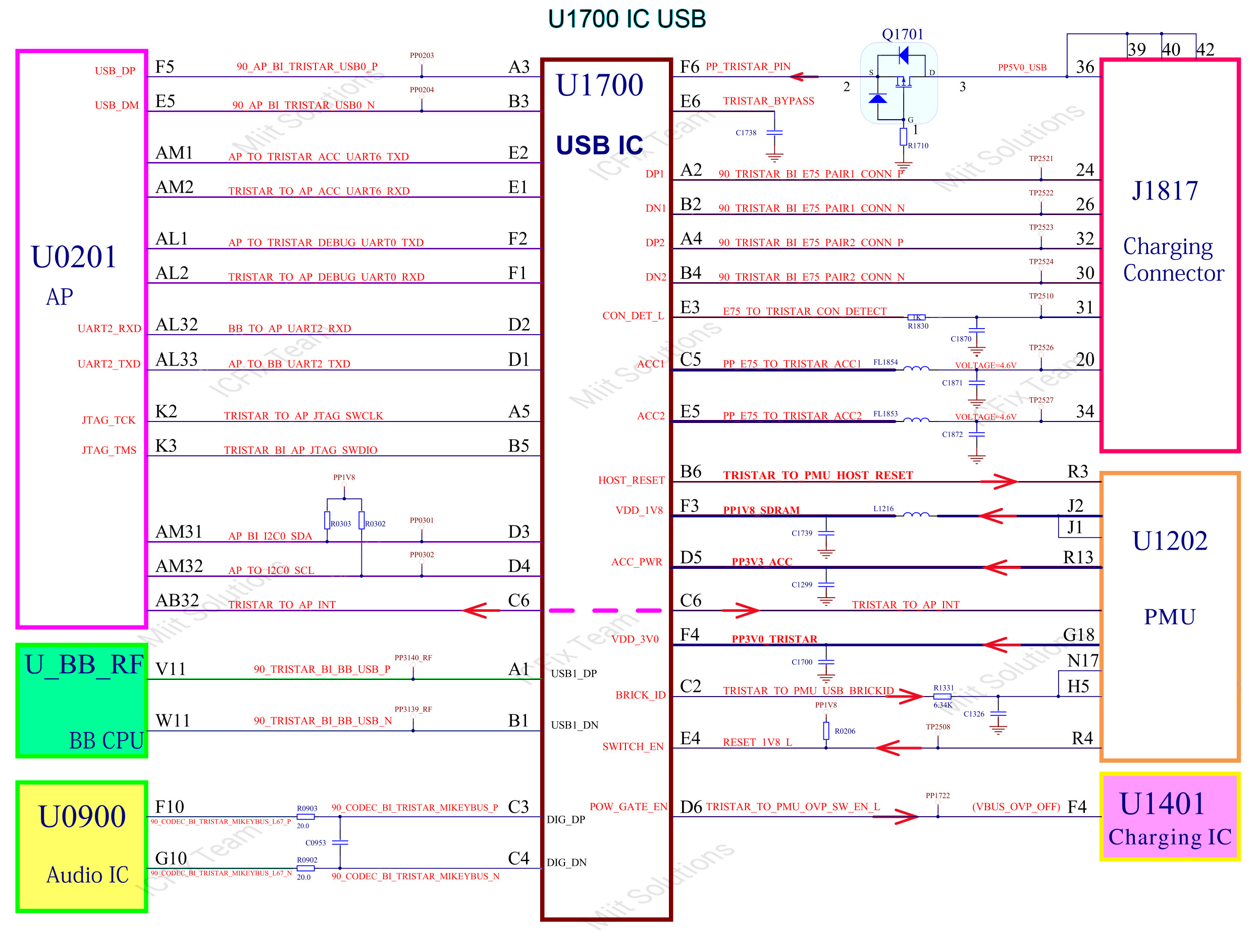 - Dựa vào sơ đồ thu gọn bên trên chúng ta tập trung đo tổng trở tại socket J1817 các chân từ IC USB U1700 đưa ra. 24 26 32 30 31 20 34 <— đo hết các chân này so sánh với main mẩu xem đúng trở không. Đúng trở thì cứ thay USB khác. Sai trở hoặc mất trở thì cách ly bỏ các tụ trên đường lỗi, câu hoặc thay thế các cuộn dây FL đặc biệt hai đường ACC1 và ACC2 hai cuộn dây rất hay lỗi.